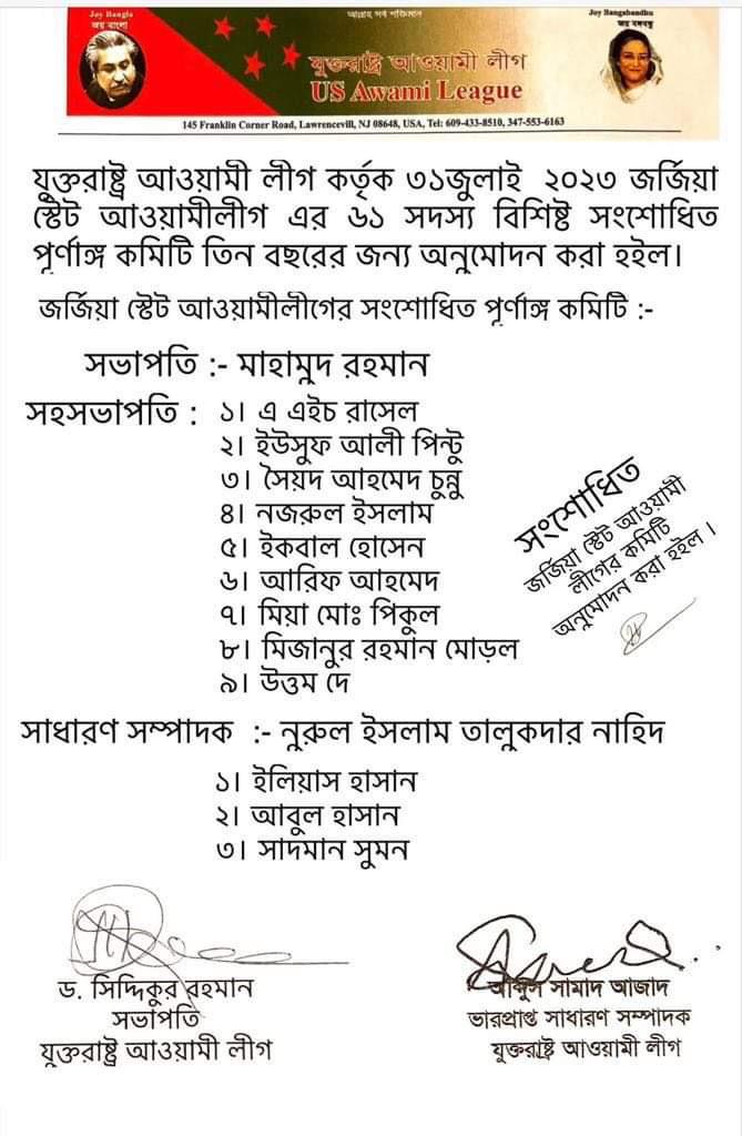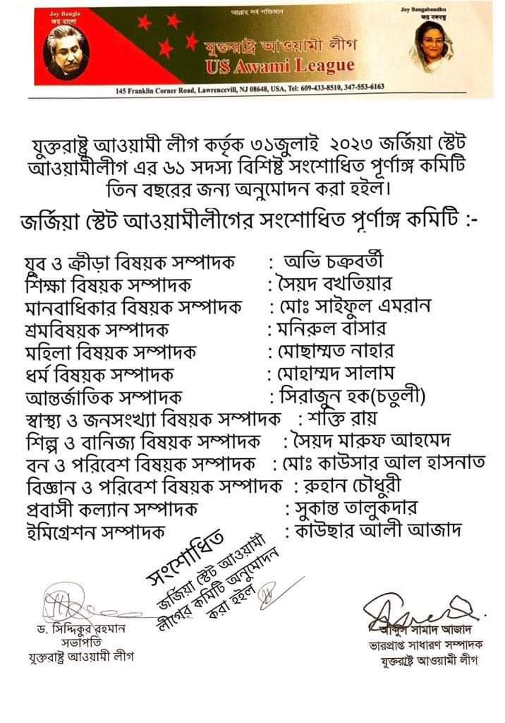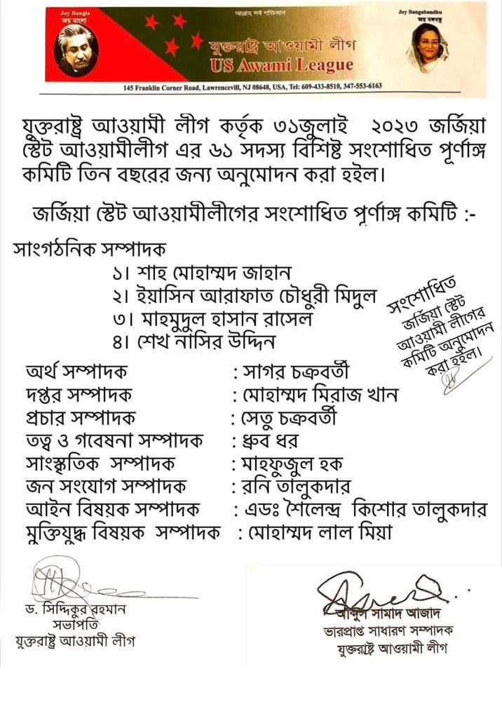 বিশেষ প্রতিবেদক : অবশেষে যুক্তরাষ্ট্র আওয়ামীলীগ ৬১ সদস্য বিশিষ্ট জর্জিয়া স্টেট আওয়ামীলীগের পূর্ণাঙ্গ কমিটির অনুমোদন দিয়েছেন।