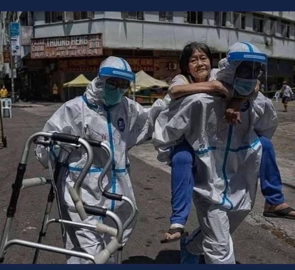 ছবিটিতে দেখা যায়, এক স্বাস্থ্যকর্মী পিঠে করে এক বৃদ্ধাকে নিয়ে যাচ্ছেন। আর তাদের সঙ্গে আর এক স্বাস্থ্যকর্মী, যিনি ওই নারীর ওয়াকারটি নিয়ে হাঁটছেন পাশে পাশে। দুই স্বাস্থ্য কর্মীই পিপিই পরে রয়েছেন।